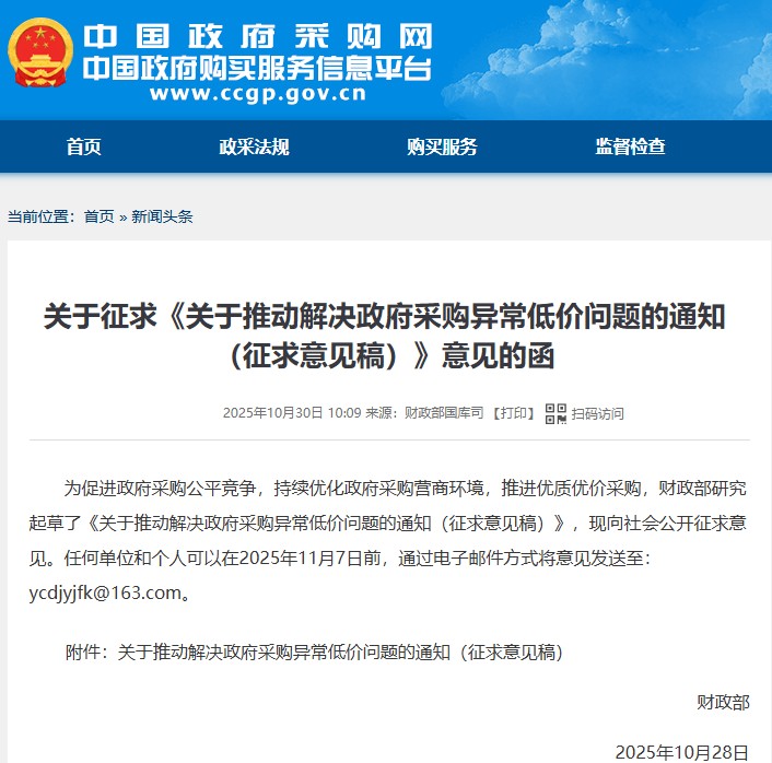 財(cái)政部就《關(guān)于推動(dòng)解決政府采購(gòu)異常低價(jià)問題的通知(征求意見稿)》向社會(huì)公開征求意見